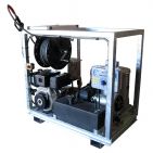 Self contained petrol powered 3000PSI hot water high pressure cleaner skid assembly. Diesel fired burner, Temp 0-150c, 25Ltr fuel tank, 30mtr Reel & Hose, Stainless Gun.